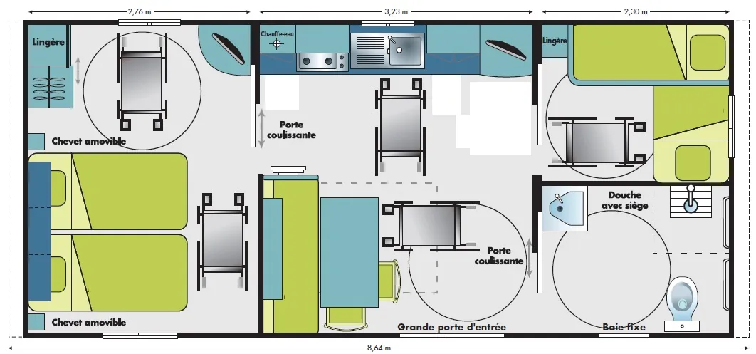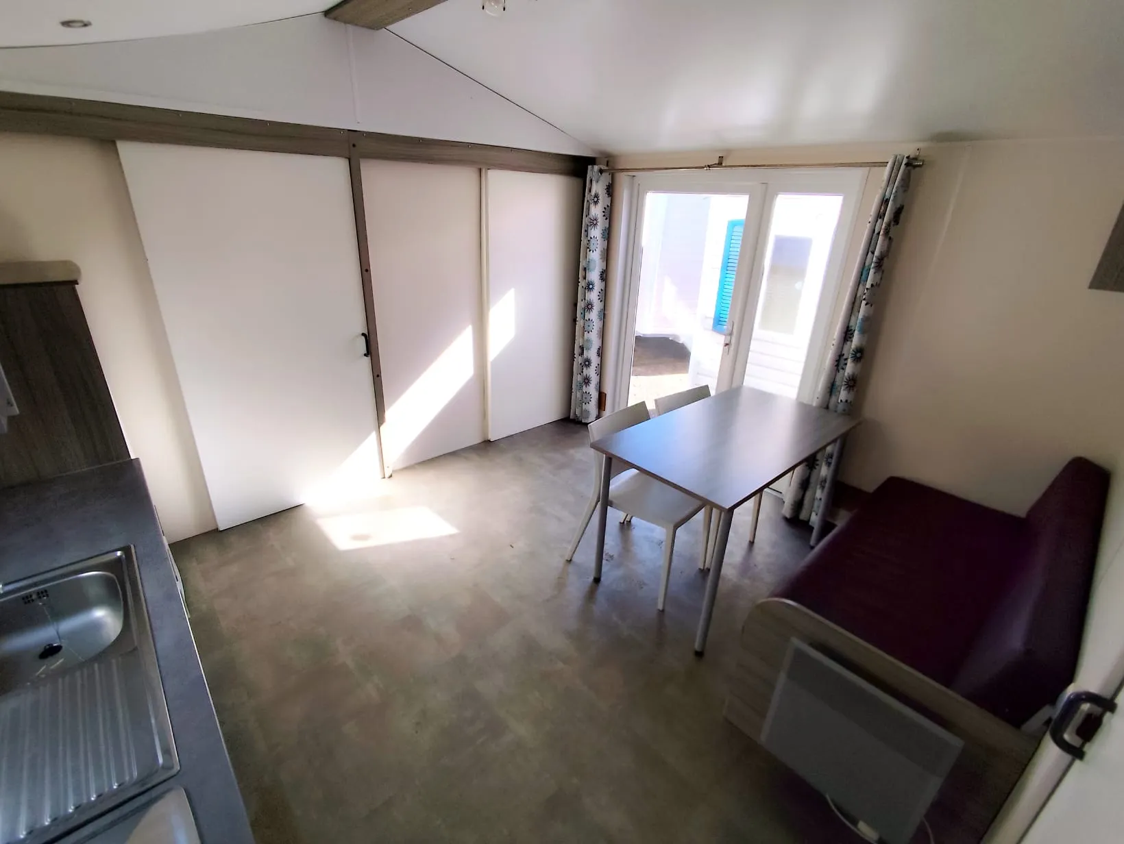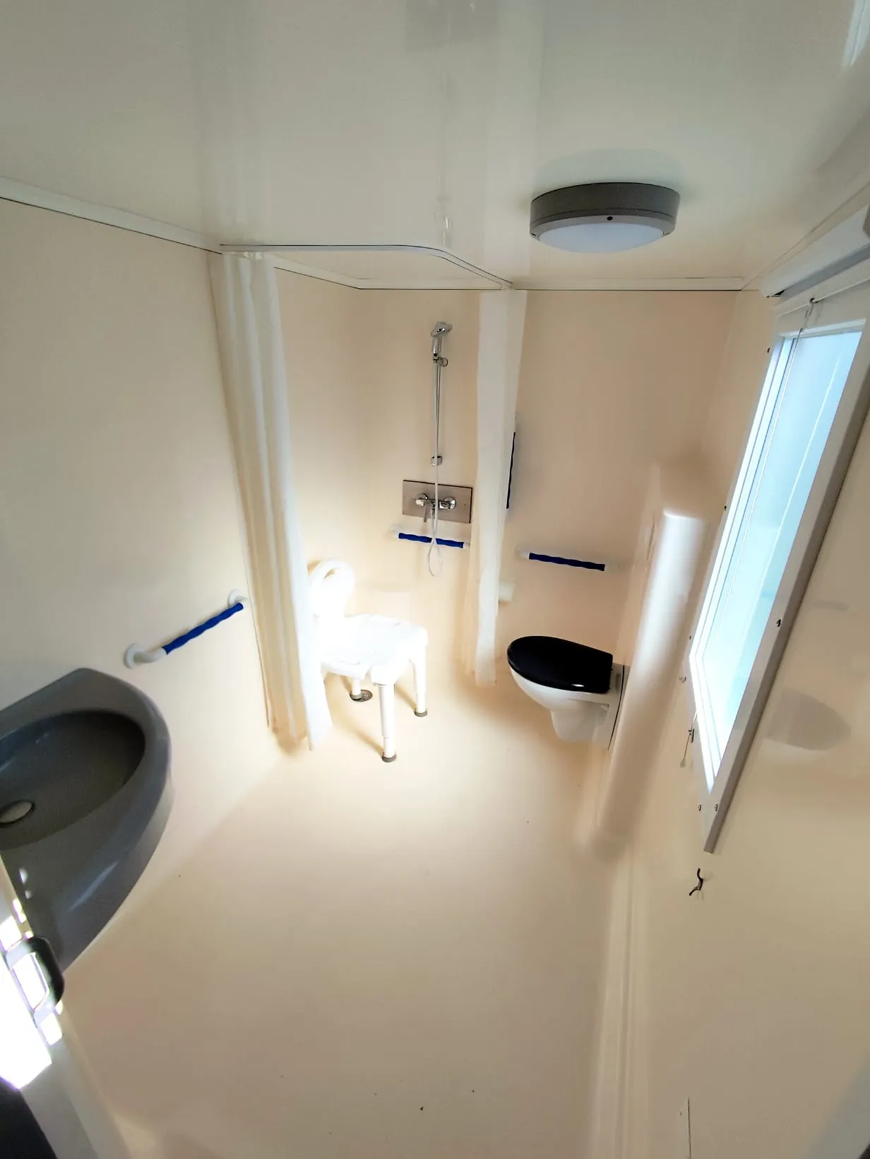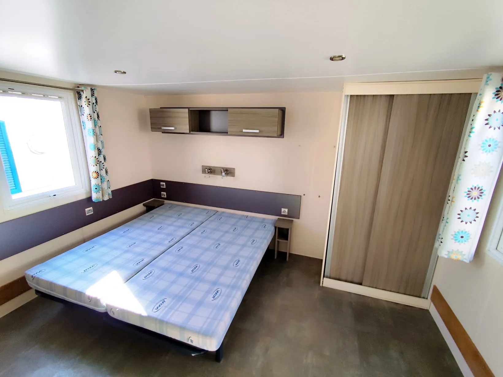 Mobil home IRM Hélios PMR de 8,64 m par 4 m, aménagé pour les personnes à mobilité réduite, 2 chambres, chambre adulte grande largeur, double vitrage, bardage PVC, salle de bains PMR, wc, 22 000 € TTC (18 333 € HT) livré avec révision soignée.