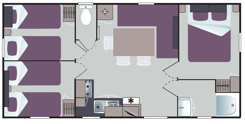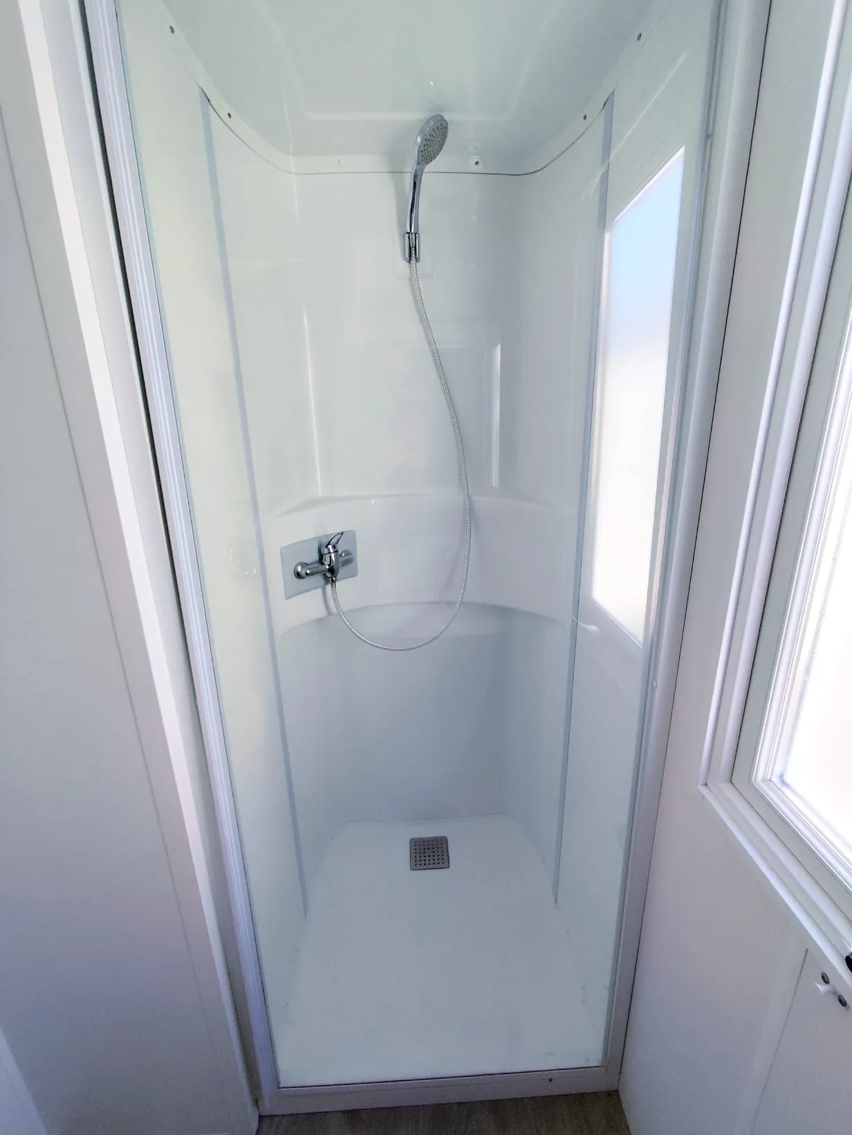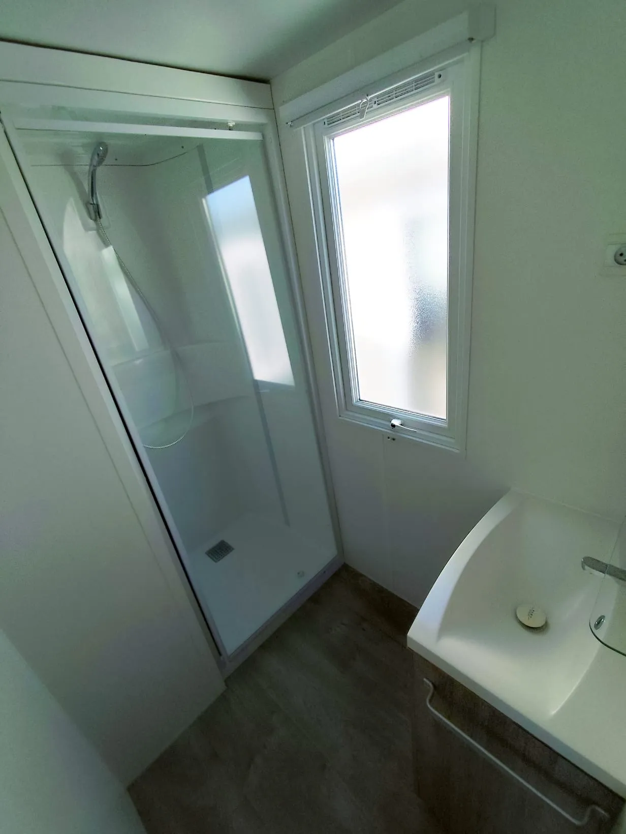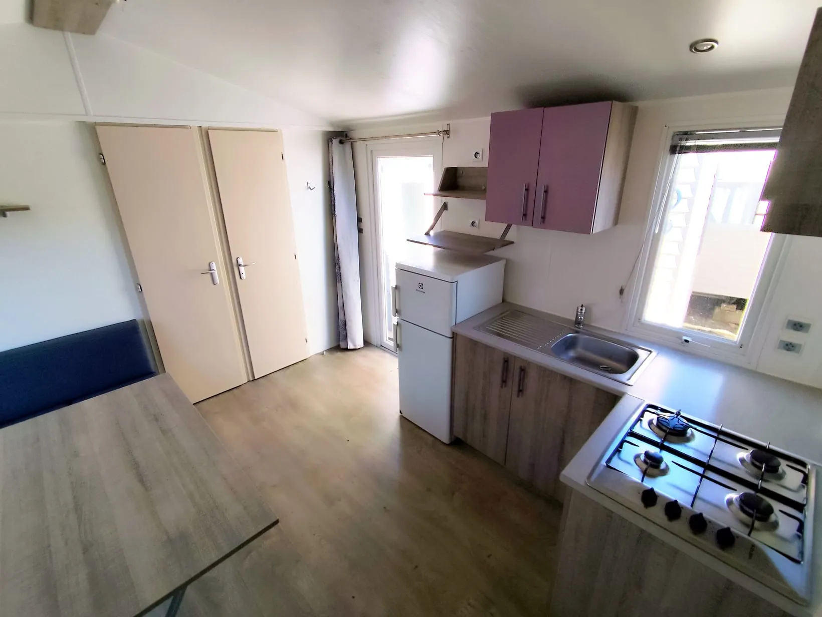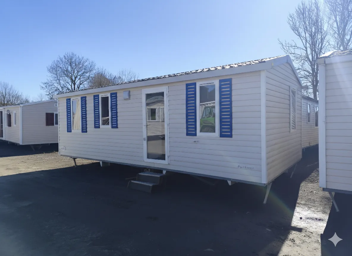 Mobil home IRM Super Titania de 8 m par 4 m, 3 chambres, double vitrage, bardage PVC, salle de bains, wc séparés, 19 000 € TTC (15 833€ HT) livré avec révision soignée.