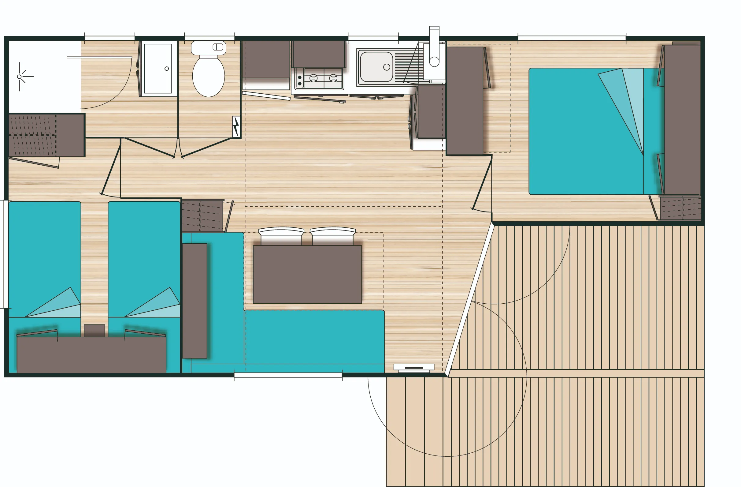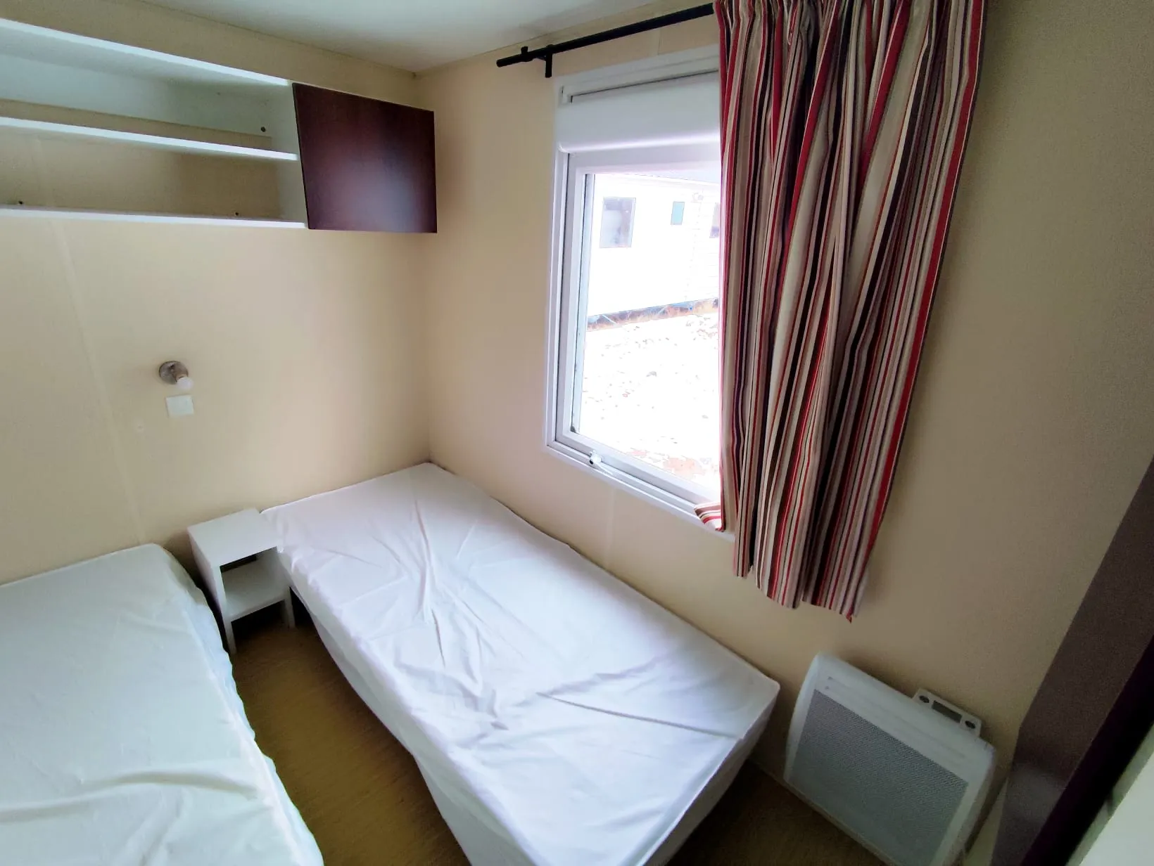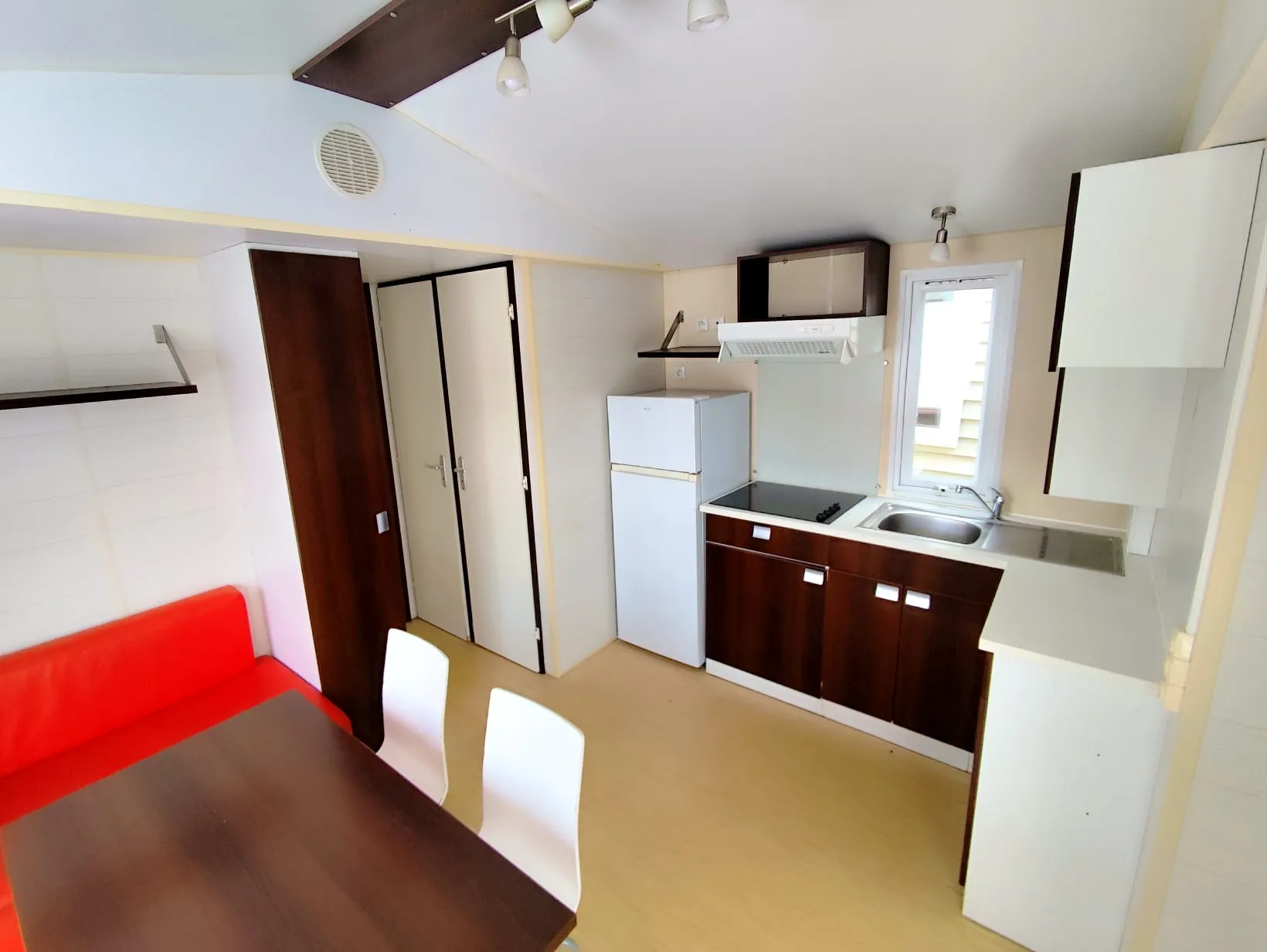 Mobil home O'Hara de 7.80 m par 4 m, 2 chambres, terrasse intégrée, un convecteur dans chaque chambres, salle de bain, wc séparés, double vitrage, bardage PVC, livré avec révision soignée pour 13 800 € TTC (11 500 € HT)
