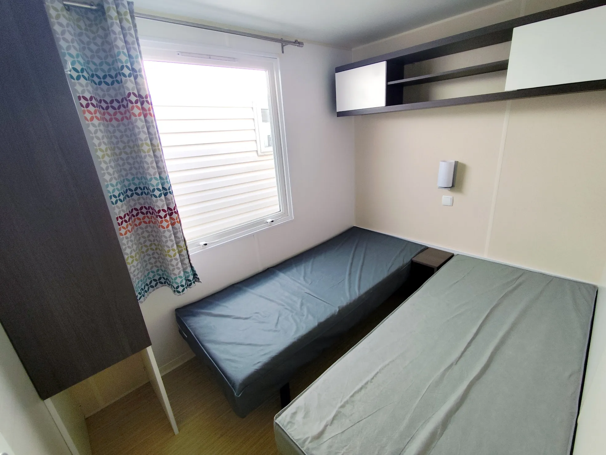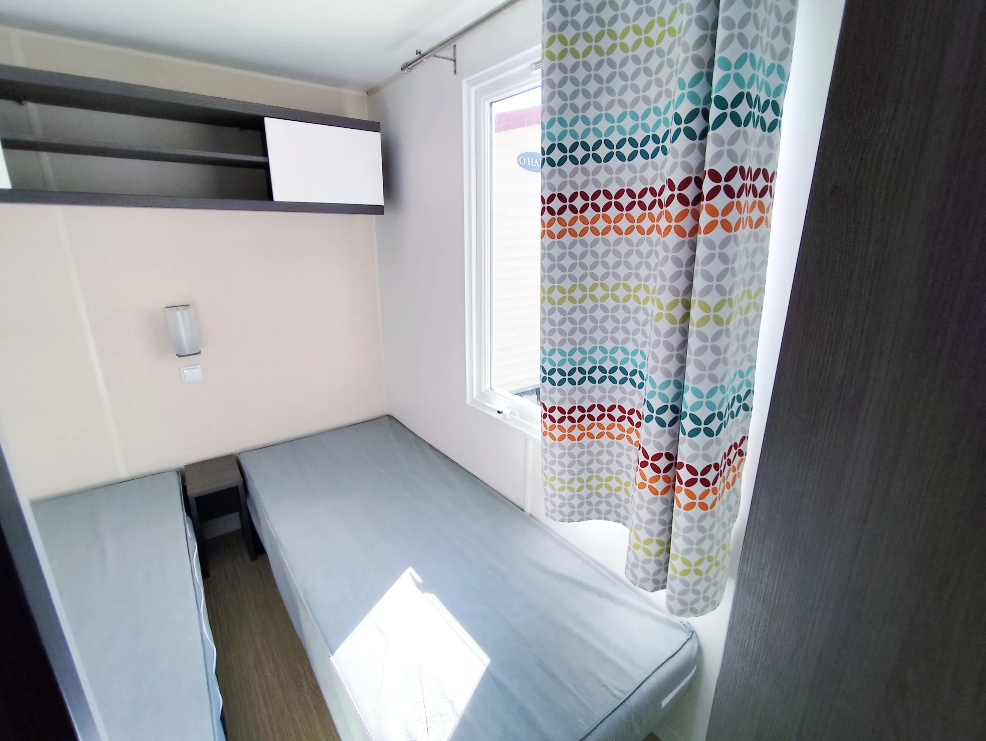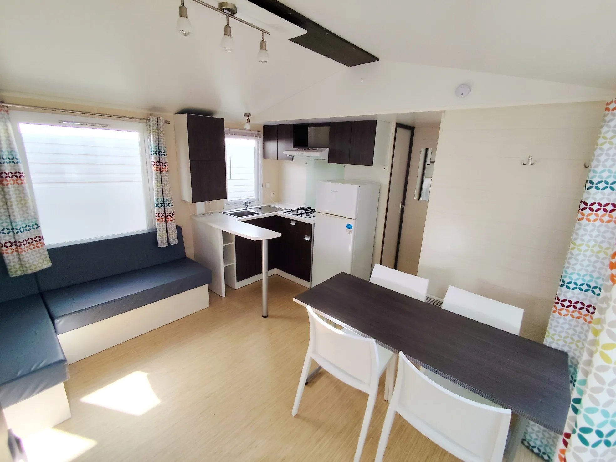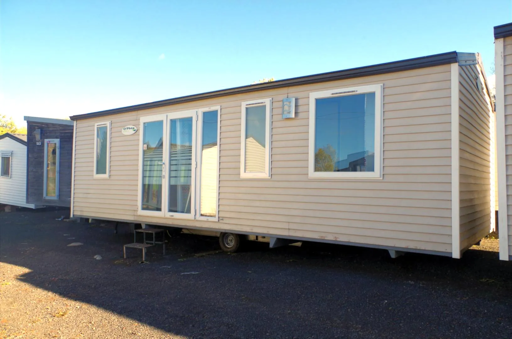 Mobil home O'Hara de 8.30 m par 4 m, 3 chambres, grande baie vitrée, salle de bain, wc séparés, double vitrage, clim réversible, bardage PVC, 18800 € TTC (15667 € HT) livré avec révision soignée.