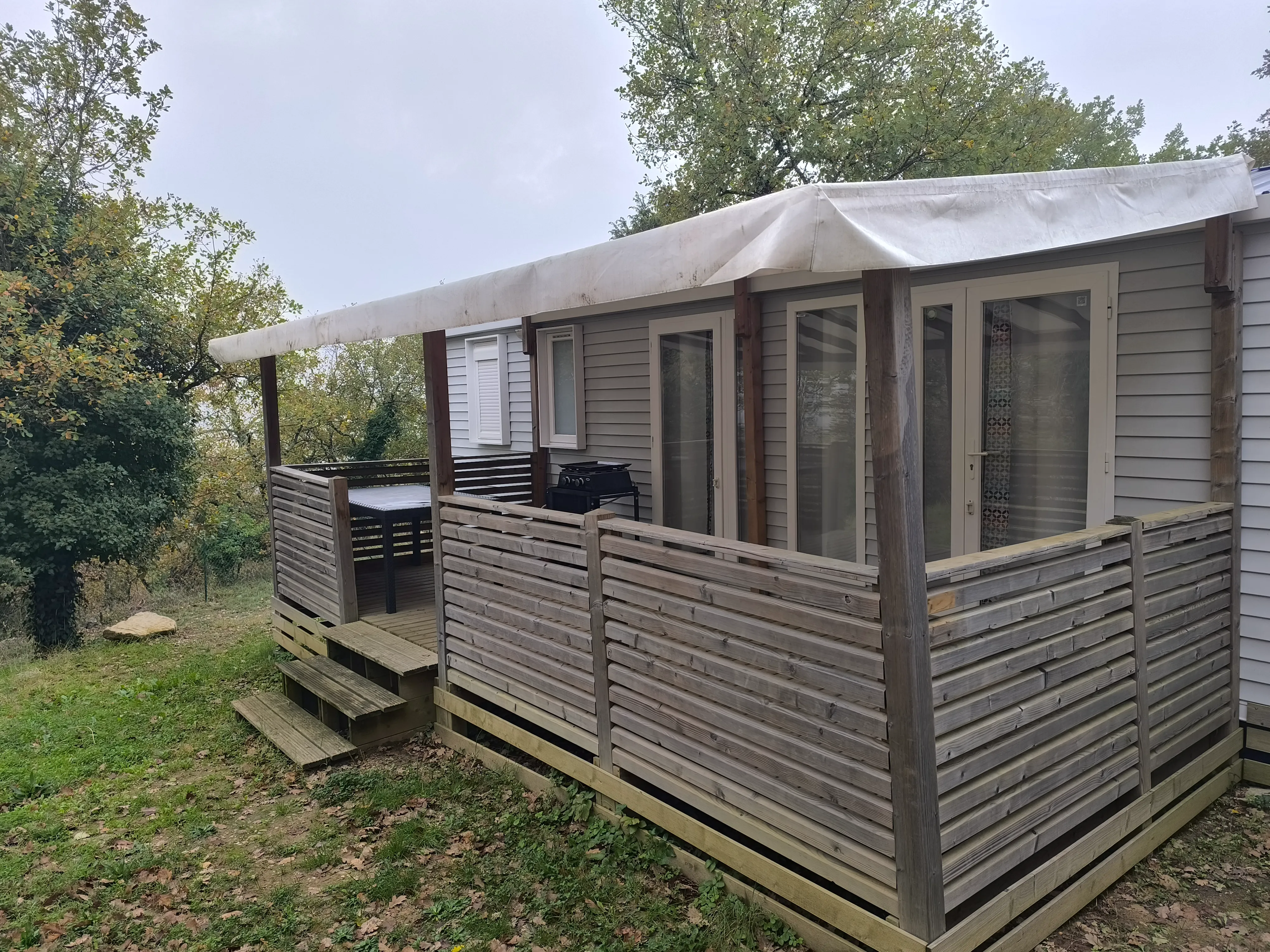 Terrasse d’occasion de 6 m x 2,5 m, couverte, terrasse démontée et palettisée, visible sur les photos avant son démontage, à prendre sur place ou livrée avec un mobil home pour 1 300 € TTC (1 083 € HT)